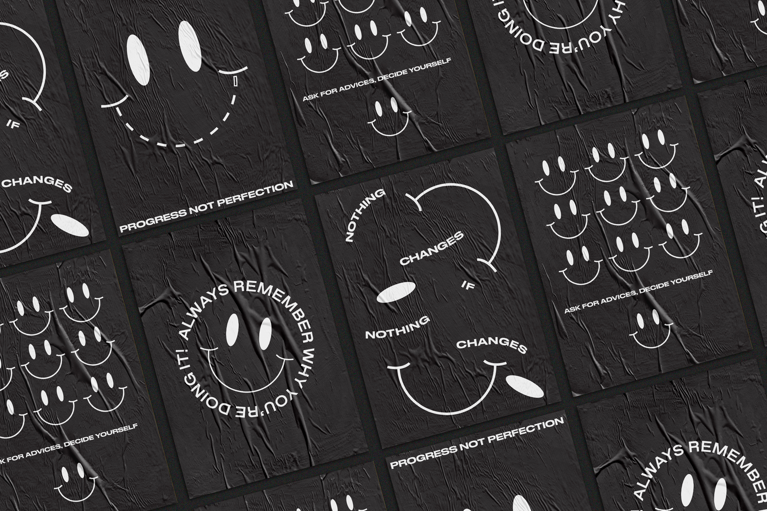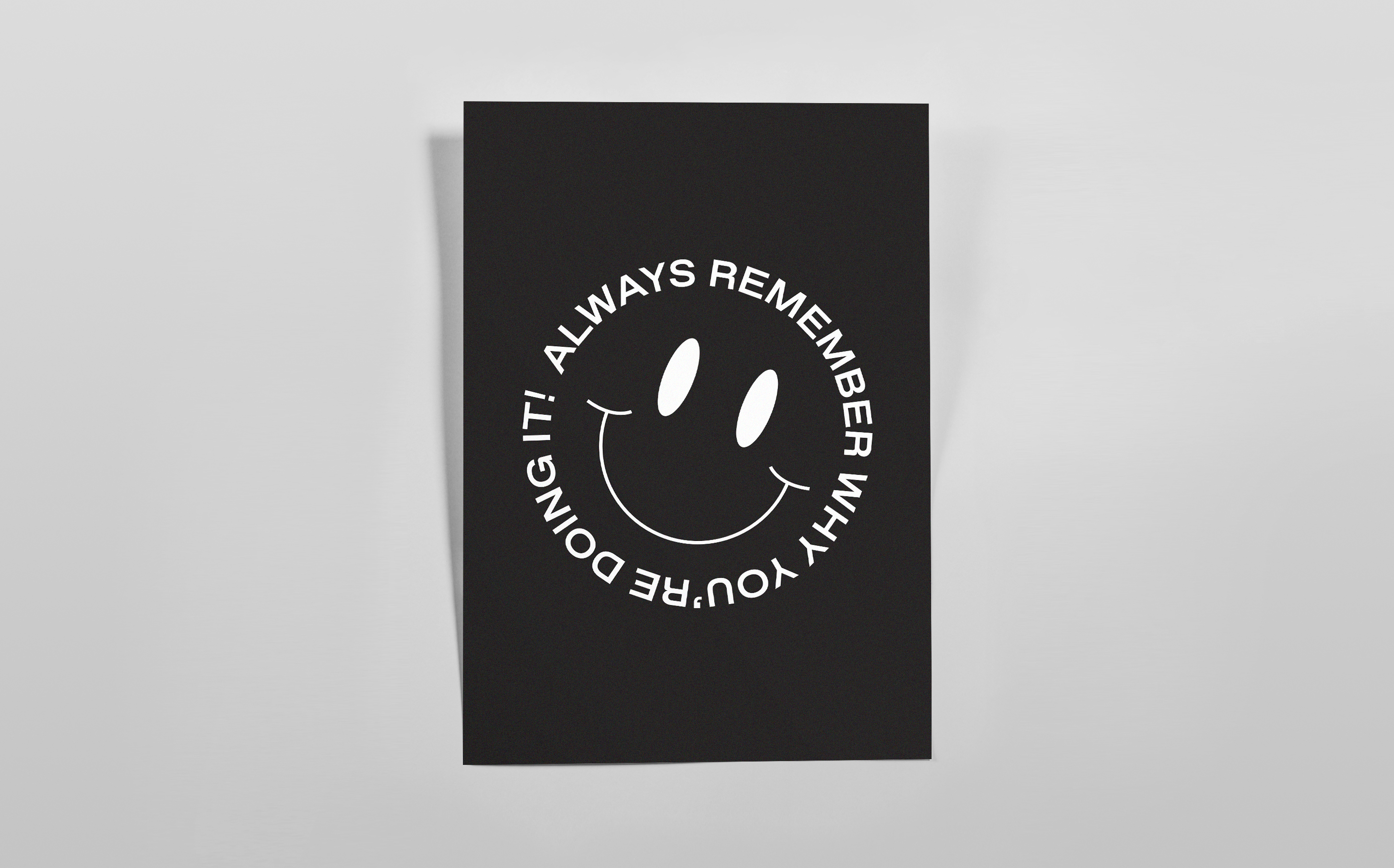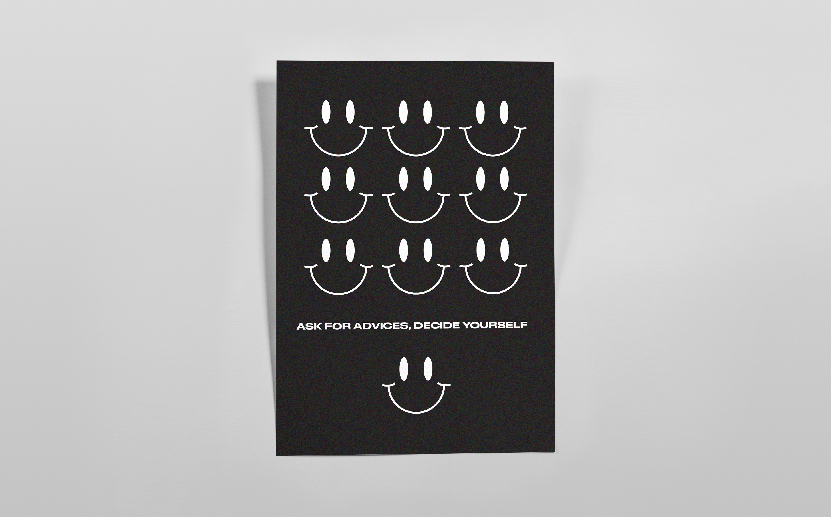 SET OF FOUR POSTERS. THE ADVICES I’D GIVE TO MY YOUNGER SELF EXPRESSED BY CREATING A VISUAL SYSTEM MADE OUT FROM A SIMPLE SMILEY.